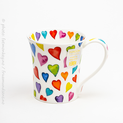 Som alle Dunoon-kopper så har den en god og romslig hank, som gjør det mulig å holde godt i den uten å brenne fingrene på selve koppen. Og som alle Dunoon-kopper er den laget i “fine bone china” – altså benporselen – i England.