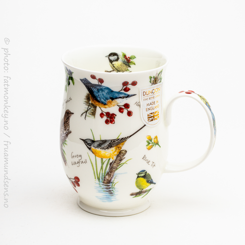 Som alle Dunoon-kopper så har den en god og romslig hank, som gjør det mulig å holde godt i den uten å brenne fingrene på selve koppen. Og som alle Dunoon-kopper er den laget i “fine bone china” – altså benporselen – i England.
