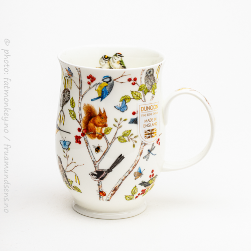 Som alle Dunoon-kopper så har den en god og romslig hank, som gjør det mulig å holde godt i den uten å brenne fingrene på selve koppen. Og som alle Dunoon-kopper er den laget i “fine bone china” – altså benporselen – i England.