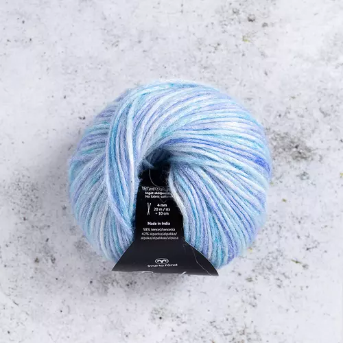 Et finmasket nett av tencel fylt med fluffy alpakkafiber. Rørgarn, blow, air eller blåst garn – uansett hva du velger å kalle det, denne garnteknologien gir et (relativt) tykt og fluffy garn uten at det blir tungt.